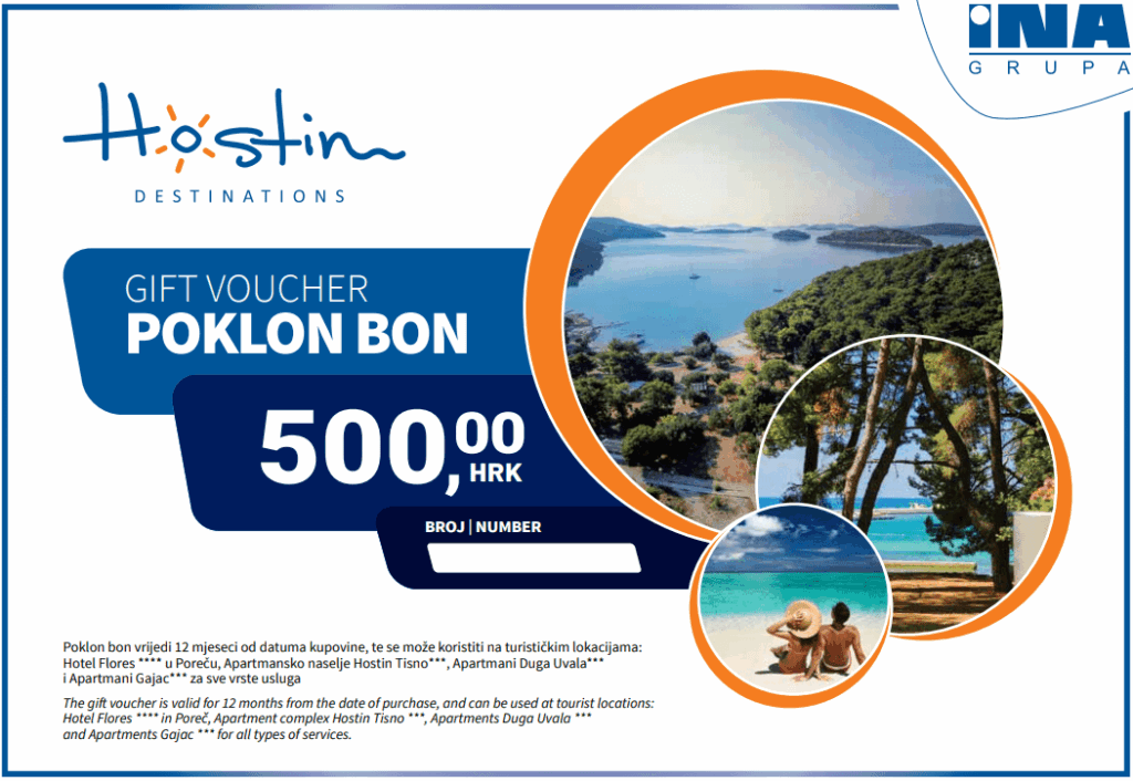 Poklon bon je moguće kupiti u dva iznosa: 500 kuna ili 1.000 kuna, vrijedi 12 mjeseci od datuma kupovine te se može iskoristitina svim turističkim lokacijama: Hotel Flores **** u Poreču, Apartmansko naselje Hostin Tisno***, Apartmani Duga Uvala*** i Apartmani Gajac*** za sve vrste usluga.